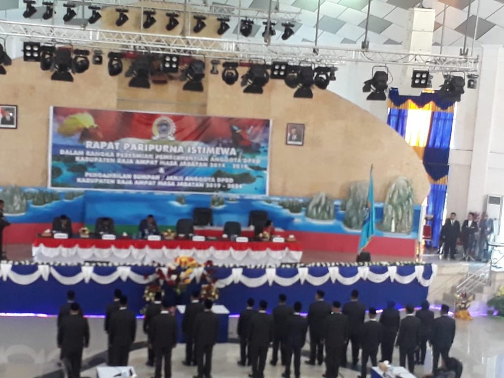 Ditandai dengan Pengucapan Sumpah dan Janji 20 anggota DPRD, dipandu oleh Wakil Ketua Pengadilan Negeri kelas IIB Sorong, Willem Marko Erari, S.H, M.H, Pelantikan yang digelar di gedung Pari Kabupaten Raja ampat, Para anggota DPRD Kabupaten Raja ampat diambil sumpah jabatan janji anggota dan menandatangani sumpah integritas.