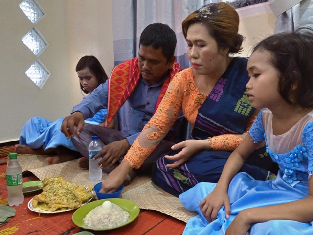 “ Sekaligus kita mendoakan agar Dani bersemangat dan berjuang bersama warga Kuata Tualah, “ ujar Nangkih Bangun, pihak kalimbubu saat memberikan makanan serta doa kepada Daniel Surbakti. (MR/Ist)