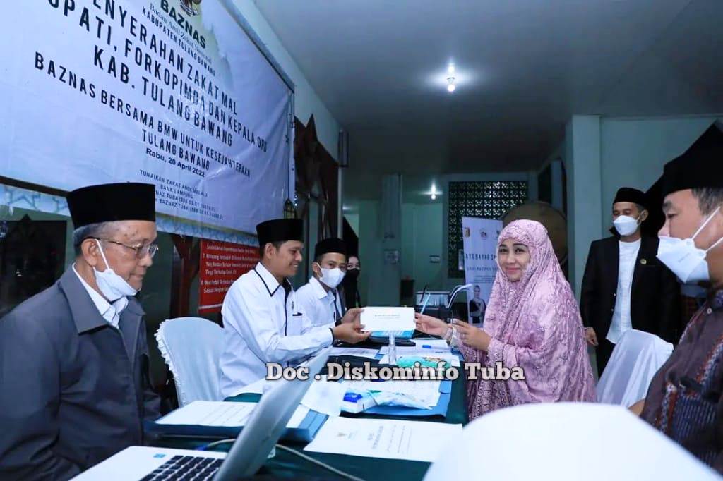Setelah sholat tarawih, Bupati Winarti lanjutkan dengan kegiatan membayar zakat di pelataran masjid Islamic center Menggala. (MR/ADV)