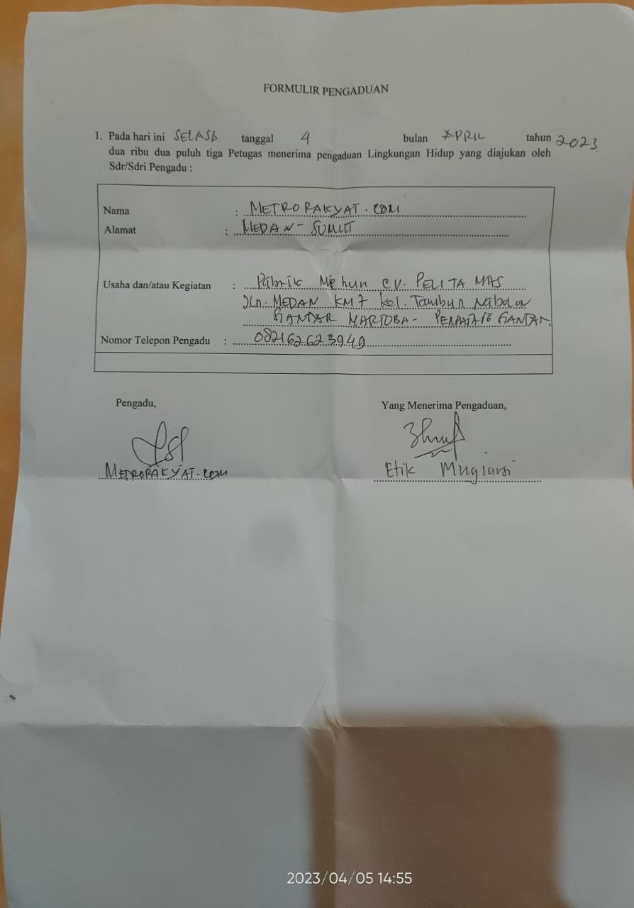 Selanjutnya pada Senin (10/4/2023) pukul 09.35 WIB lewat pesan singkat WhatsApp pelapor menerima surat tembusan dari dinas lingkungan hidup yang berisi undangan untuk menghadiri dan mendengarkan penjelasan terkait dugaan aroma tidak sedap dari limbah CV Pelita Mas pada Senin (10/4/2023) pukul 09.00 WIB bertempat di kantor Dinas Lingkungan Hidup Jalan Rakuta Sembiring no 86 Kota Pematang Siantar yang ditandatangani oleh kepala dinas Dedy Tunasto Setiawan.