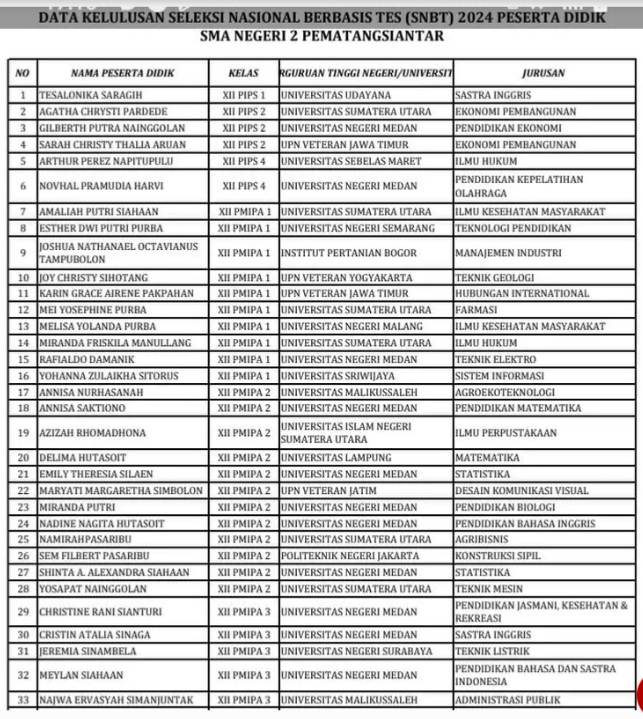 SNPMB Tahun 2024 Resmi Diumumkan Selamat..!! 57 Siswa SMAN 2 Pematangsiantar Lulus Lewat Jalur SNBT, 34 Siswa Sebelumnya Lulus Jalur SNBP