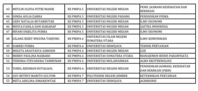 Dari hasil pengumuman tersebut, Selamat..!! Sebanyak 57 orang siswa SMA Negeri 2 Pematangsiantar Provinsi Sumatera Utara berhasil lulus masuk dan diterima di sejumlah perguruan tinggi negeri (PTN) favorit yang ada di sejumlah wilayah Indonesia.